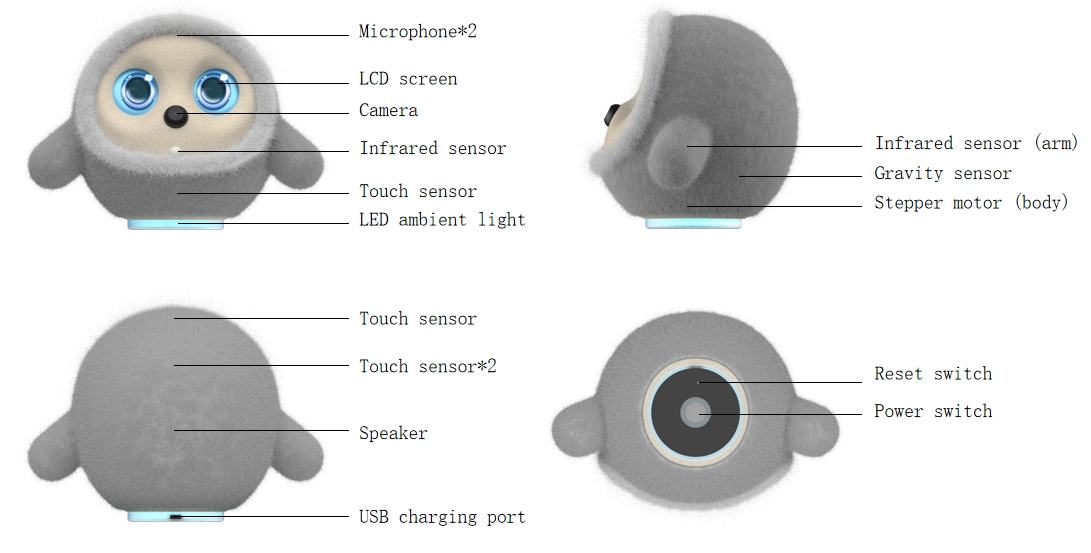 | एलसीडी अभिव्यक्ति स्क्रीन | 4.28 इंच की एलसीडी स्क्रीन (आंखें), गतिशील अभिव्यक्ति डिस्प्ले और दूरबीन डिस्प्ले (जैसे) का समर्थन करती है दृश्य प्रतिक्रिया जब "मृत की भूमिका निभाना" या "प्यारा अभिनय करना")। |