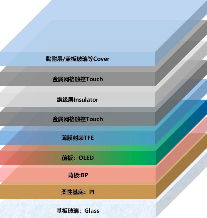 इसकी मुख्य संरचना में एक OLED प्रकाश उत्सर्जक परत, TFT बैकप्लेन, धातु इलेक्ट्रोड, सब्सट्रेट ग्लास और आवरण शामिल हैं।