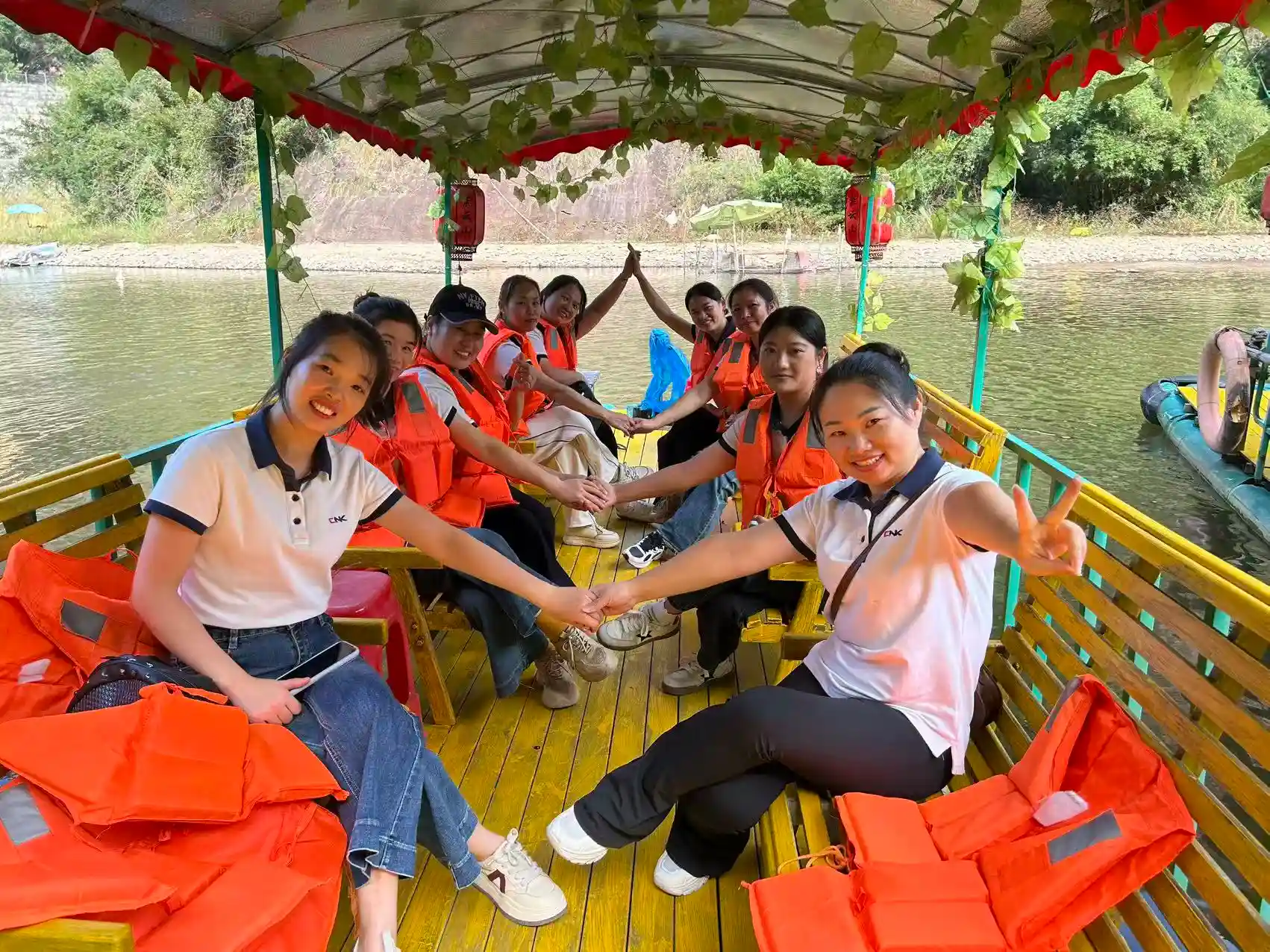 दोपहर का कार्यक्रम अधिक आरामदायक था। पूरी टीम आश्चर्यजनक परिदृश्य के दस ली के माध्यम से एक सुंदर यात्रा के लिए बांस के राफ्ट पर सवार हुई। डेनक्सिया पहाड़ों और पन्ना पानी के बीच फिसलते हुए, उन्होंने सुरम्य दृश्यों की प्रशंसा की, जहां "हरे पहाड़ अंधेरे भौहों की तरह खड़े हैं और साफ पानी रेशम की तरह बहता है।" 3.2 किलोमीटर के जल मार्ग पर, सभी ने आराम किया, खुद को प्रकृति की शांति और सुंदरता में डुबो दिया।