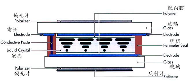 एलसीडी की मुख्य संरचना में कई सटीक लेमिनेटेड सामग्रियां शामिल हैं, जिनमें पोलराइज़र, इलेक्ट्रोड, प्रवाहकीय पेस्ट, लिक्विड क्रिस्टल, संरेखण फिल्में, ग्लास सब्सट्रेट, परिधि सील और रिफ्लेक्टर शामिल हैं। प्रत्येक सामग्री परत अद्वितीय कार्य करती है: