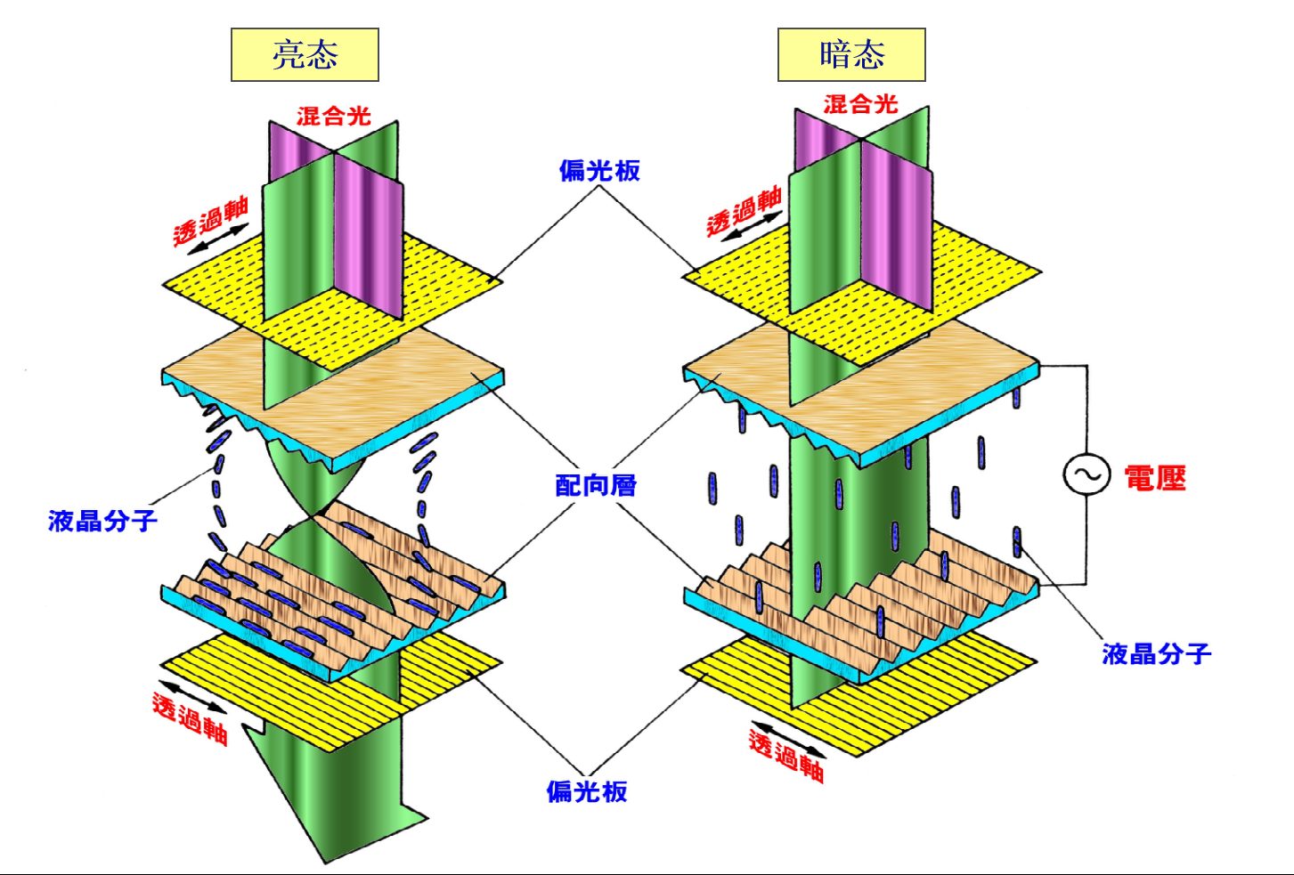 अंधेरे अवस्था (प्रदर्शन अवस्था) में, उन क्षेत्रों में लिक्विड क्रिस्टल अणु जहां विद्युत क्षेत्र लागू होता है, अपना संरेखण बदल देते हैं और अपनी प्रकाश-घूर्णन क्षमता खो देते हैं। सामने वाले ध्रुवीकरणकर्ता से उत्सर्जित ध्रुवीकृत प्रकाश दिशा नहीं बदल सकता है और अवरुद्ध हो जाता है क्योंकि इसकी ध्रुवीकरण दिशा पीछे वाले ध्रुवीकरणकर्ता की ध्रुवीकरण दिशा के लंबवत होती है, जिससे ये क्षेत्र काले दिखाई देते हैं।
